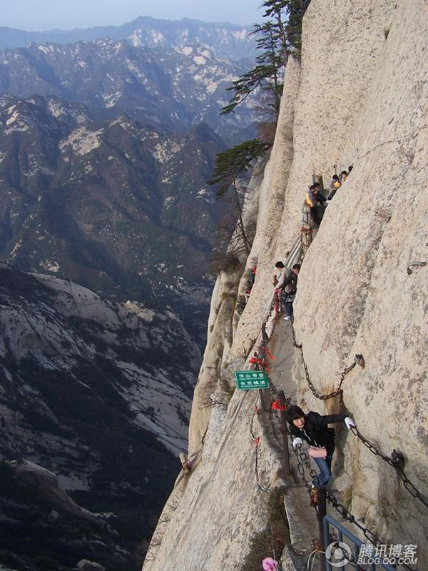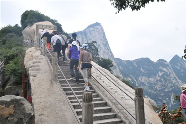 ,連猴子都發(fā)愁,說明崖壁是多么陡峭了。在這兩處,我們第一次領略了華山的“險”,真所謂舉步艱難。這時,走在前面的樊部長不斷的回頭告誡大家,手要抓穩(wěn),腳要踩實。吳總也是一次一次鼓勵大家,堅持到底,就是勝利,同時又將兩個員工的行李背在了自己肩上。在他們這種精神的感召下,就連我們團隊中年齡最大的王經(jīng)理也不甘示弱,奮勇直上。這時有個膽小的女游客發(fā)出驚叫,原來她在回頭看時,對著陡峭的山谷一下恐慌起來,同伴們沒有放棄,一片鼓勵聲中,伸出堅強有力的臂膀推著她,一起越過險關。道路雖是艱險,可也讓我們感受到,一步一個驚喜,一步一次超越。