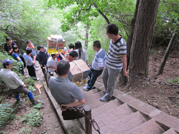 挑山夫,年齡均在四五十歲,身材都較為消瘦,皮膚黝黑。其中一人臉上棱角分明,像是刀刻,眼睛直視,一根彎彎的扁擔兩端擔負著沉甸甸的日用品,約有五六十斤重,以至于他的背部下趨,在陡峭的石階上匍匐前行。早就聽說華山上所需生活物資除了人挑肩扛,也沒有別的運送途徑,故多年來自然形成了一支以往山頂運送物資謀生的華山“棒棒”軍。他們每天都馱著上百斤的東西,走在險峻而陡峭的山道上往返數(shù)趟,純樸、豁達、樂觀、不畏艱險,除了馱東西外還在休息時為過往游客表演民歌或流行歌曲,博得游客的陣陣掌聲,過往游客也因此會施舍給“棒棒”些食物或零錢,成為華山旅游資源的一道有趣人文景觀。可今日見了,仍不免震驚,游人自然地靠邊,讓出一條通道,看著他們一步步上行。我知道,這時所有人心中除了些許同情之外,更多的是一種敬意。挑山夫們,為了滿足山上人的生活需要,負重攀登,每天每步都充滿危險,這樣的生存方式才更令人尊重。在這懸崖陡壁間,和他們相比,我們?yōu)樯冻鲞^多少努力?又憑什么感嘆命運不公?